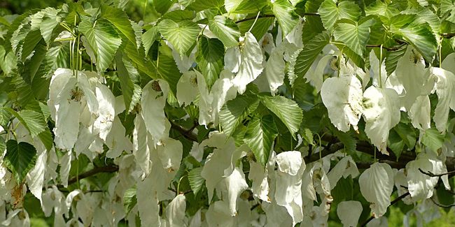Avec sa silhouette conique et son écorce grise lisse, l'arbre aux mouchoirs développe des feuilles caduques ovales, dentées et pointues, qui arborent un joli pétiole rouge. Le dessous des feuilles est doux au toucher, et leur couleur vert moyen ajoute une touche de fraîcheur. Les fleurs, qui éclatent en mai-juin, laissent place à des fruits pendants striés brun verdâtre, mesurant entre 2 et 4 cm, qui décorent encore l'arbre durant l'hiver.