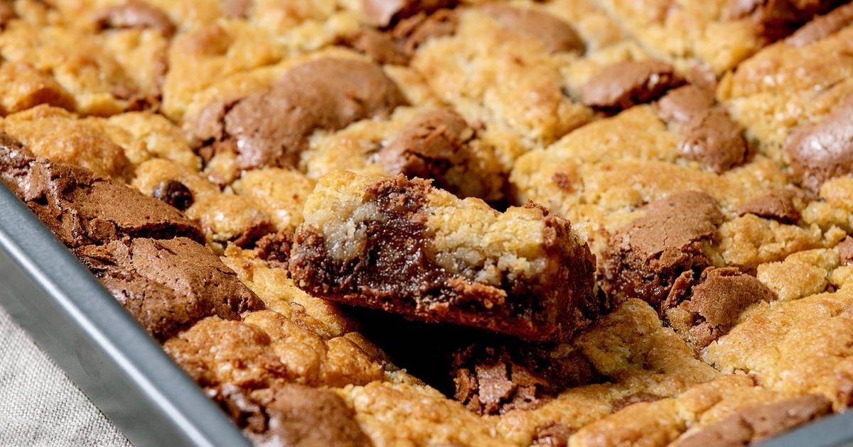 - Recouvrir avec le reste de pâte à cookie et parsemer de pépites de chocolat.