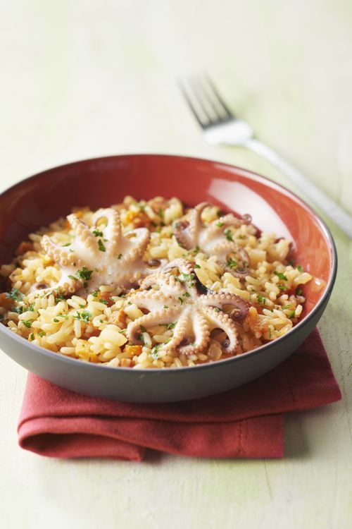 Le jour même, faites cuire les poulpes dans une poêle à feu vif ou sur une plancha, en veillant à bien les saisir pour un goût optimal. Pendant ce temps, dans une autre poêle, faites revenir le riz à feu moyen pendant environ 3 minutes, en remuant de temps à autre jusqu'à obtenir une belle coloration.