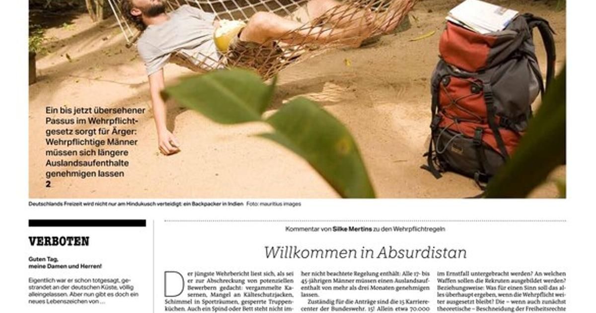 Un Allemand désireux de partir à l'étranger pour un semestre, de prendre un congé sabbatique ou d'entreprendre un projet professionnel devra désormais obtenir l'autorisation de l'armée. Cette décision controversée incite le journal berlinois à faire remarquer : "La Bundeswehr contre tout déploiement à l'étranger, tant qu’il est privé."