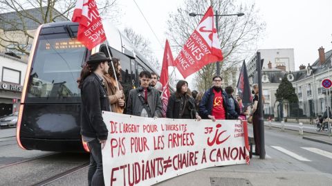 Ce jeudi 5 mars, une trentaine de manifestants, arborant les couleurs de Solidaires étudiant-e-s, de la Fédération syndicale étudiante, et du Mouvement des jeunes communistes, se sont mobilisés devant la caserne Raby à Tours. Ils expriment leur ferme opposition à la militarisation du pays, l’armement et la guerre. La mobilisation a vu une présence policière significative, bien moins nombreuse toutefois que les manifestants.